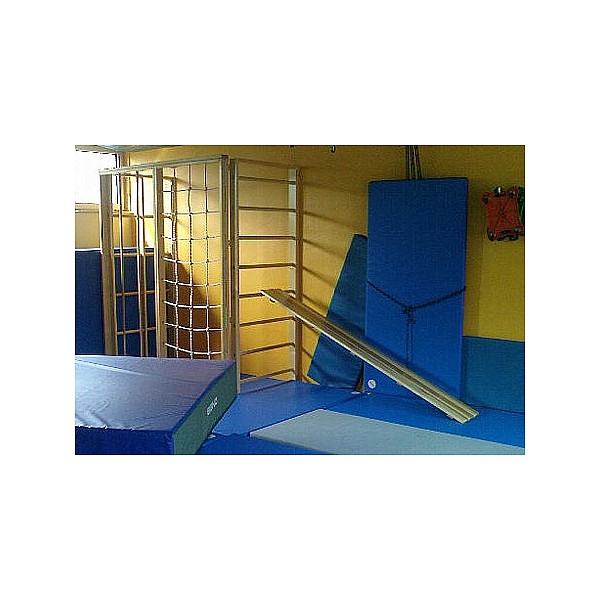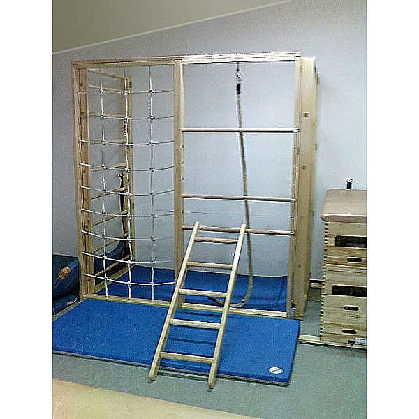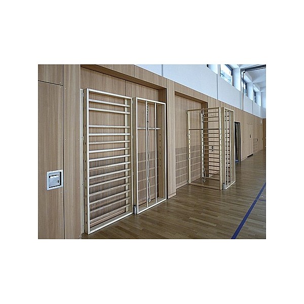 1 Sprossenwand element with a narrow or wide rung spacing, Kletterstangen- 1 and 1 grating element. Complete with all mounting hardware (dowels). Required wall width 315 cm, height 240 cm. Depth expanded cm 115, folded 25 cm. (3x figure shows pivoting wall)