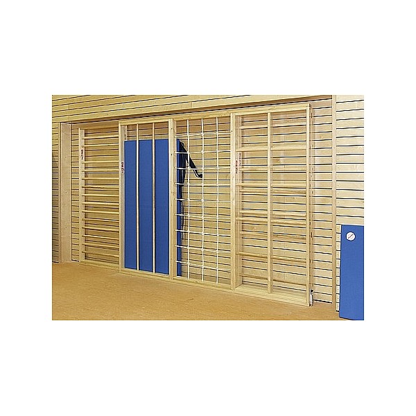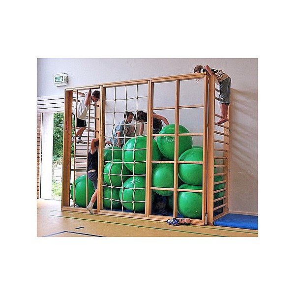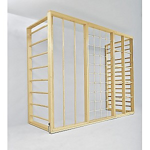 1 wall bar element with wide and narrow rung spacing, 1 Kletterstangen-, 1 Kletternetz- and one grid conductor element - complete with all fittings and mounting hardware (dowels). Measurements: Required wall width 415 cm, height 240 cm. Depth expanded cm 115, folded 25 cm.