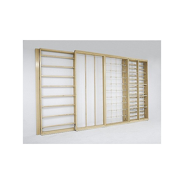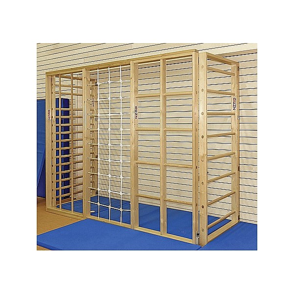 1 wall bar element with wide and narrow rung spacing, 1 Kletterstangen-, 1 Kletternetz- and one grid conductor element - complete with all fittings and mounting hardware (dowels). Measurements: Required wall width 415 cm, height 240 cm. Depth expanded cm 115, folded 25 cm. The TÜV Austria -certified Turn walls allow the folded state a space-saving installation on the wall (when folded not beturnbar!). When unfolded, they offer allerbesteNutzungsmöglichkeiten and lots of play and climbing through. In the unfolded state, the parts are locked by means of the bottom stopper. The walls are supplied with all fittings and mounting hardware.