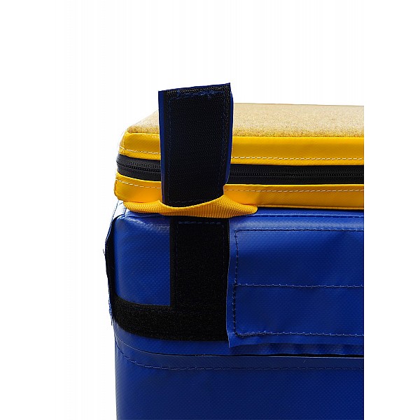 With Velcro safety system, cover made of PVC tarpaulin with ventilation eyelets and carrying handles, with joint closure and connection flap for connecting any number of soft floors. Specifications: Easy to clean surface Non-slip profiled underside Carrying handles for easy portability Including Velcro connection flaps on the front and long sides Air grommets for optimal ventilation Suitable for indoor and outdoor use (outdoor mats and a rain cover are required) Default color: Blue Material: Eco-friendly PVC Foam mat core: RG 22 foam According to DIN EN 12503-1 type 8 Area of application: School and club Fitness, training, coordination Functional training Athletics