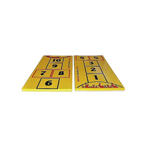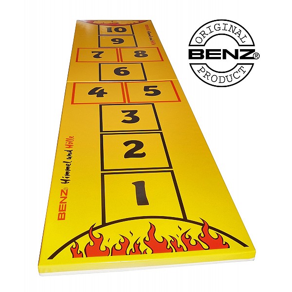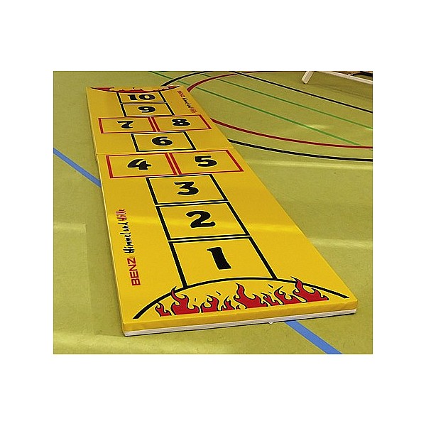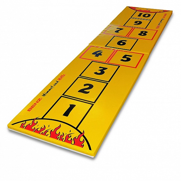 The popular Hüpfspiel heaven and hell, that can be played in many variants, was taken up again by us and printed on two gym mats. The mats are connected by means of Velcro tape to prevent slipping.