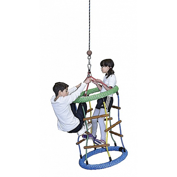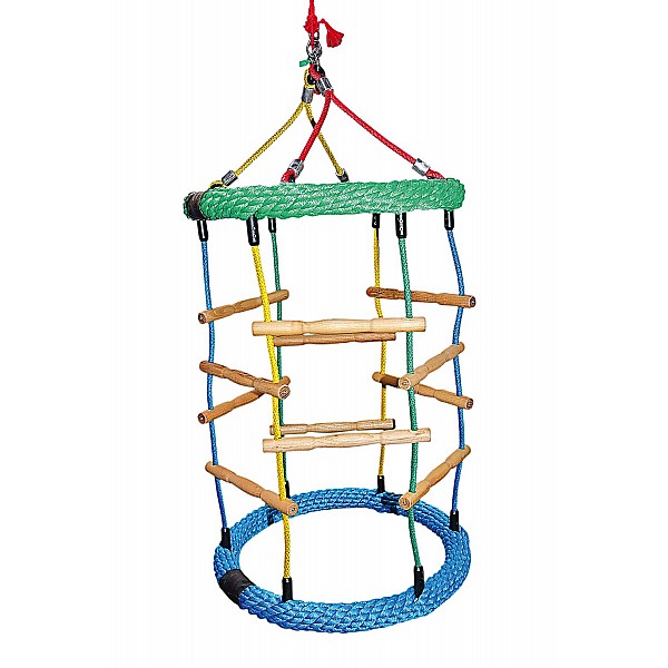 The Climbing chimney carousel is a climbing element with rotary and wobbling and extremely popular with children. Ø 70 cm, suspension height 200 cm, Hercules ropes, rope rings 2 about 65 mm thick and sprouts from acacia wood. Without standard suspension bearings. Minimum distance away from the furthest point of equipment to the next fixed construction part 1.00.