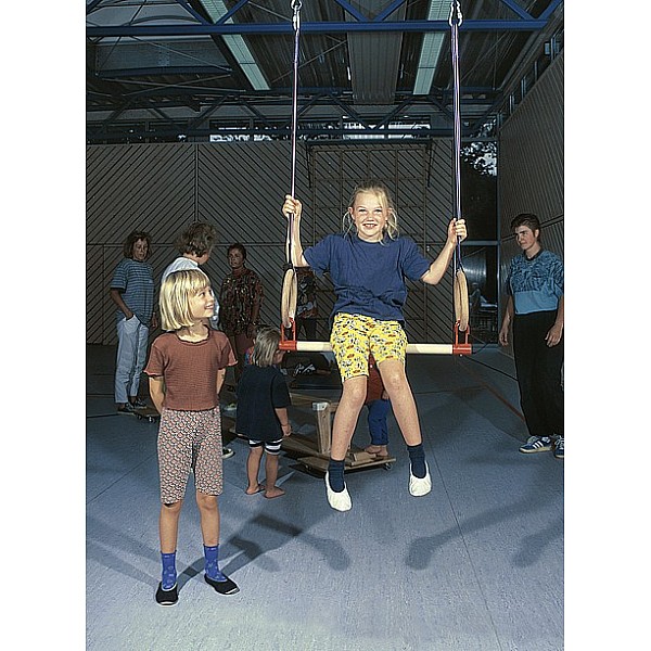 Trapeze bar made of beech wood for hanging in gymnastics rings.