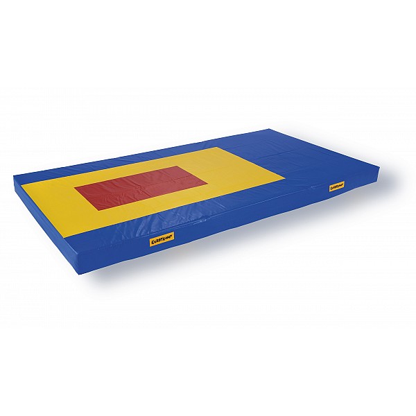 Mats coating, 600x300x30 cm, yellow landing zone 400x200 cm, red landing zone 200x100 cm, for optimum orientation at the landing for double-Minitramp.Der coating can be pulled to 3 Soft floor mats 200x300x30cm .. (without soft floor mats)