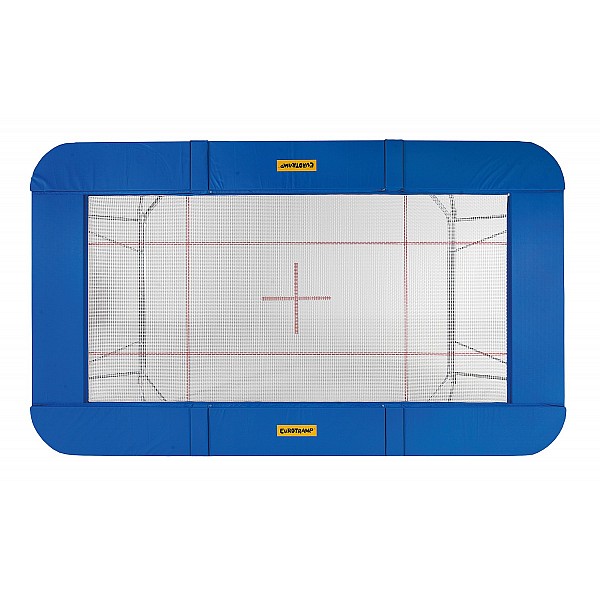 Jumping sheet of 45 mm wide woven nylon straps, held by 118 steel springs. Setting: flat oval tube (galvanized), 520 x 305 x 108 cm (L x W x H). Jumping sheet: 426 x 213 cm. Shock absorbing and stable frame pads full coverage. Weight 220 kg.