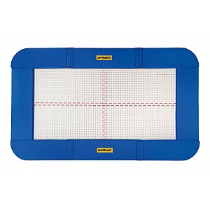 Jumping sheet of 45 mm wide woven nylon straps, held by 118 steel springs. Setting: flat oval tube (galvanized), 520 x 305 x 108 cm (L x W x H). Jumping sheet: 426 x 213 cm. Shock absorbing and stable frame pads full coverage. Weight 220 kg.