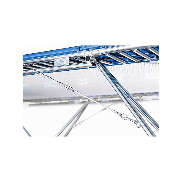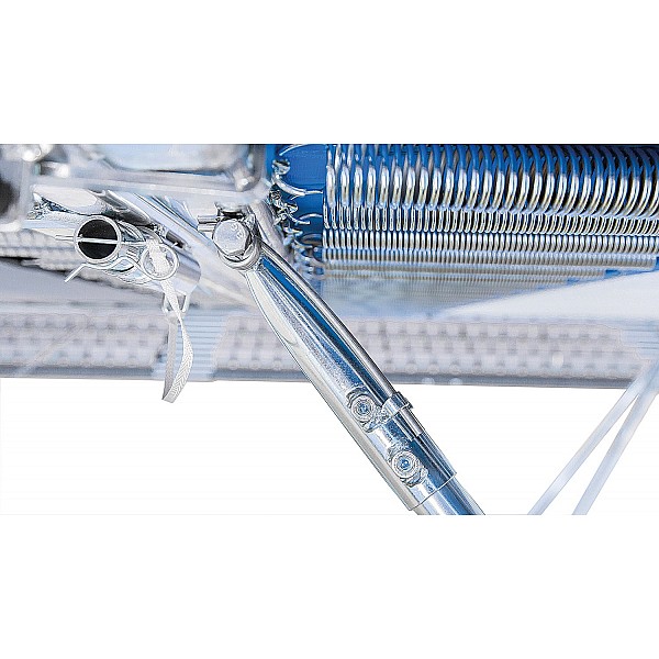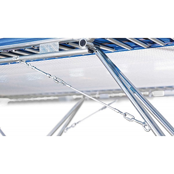 Jumping sheet of 45 mm wide woven nylon straps, held by 118 steel springs. Setting: flat oval tube (galvanized), 520 x 305 x 108 cm (L x W x H). Jumping sheet: 426 x 213 cm. Shock absorbing and stable frame pads full coverage. Weight 220 kg.