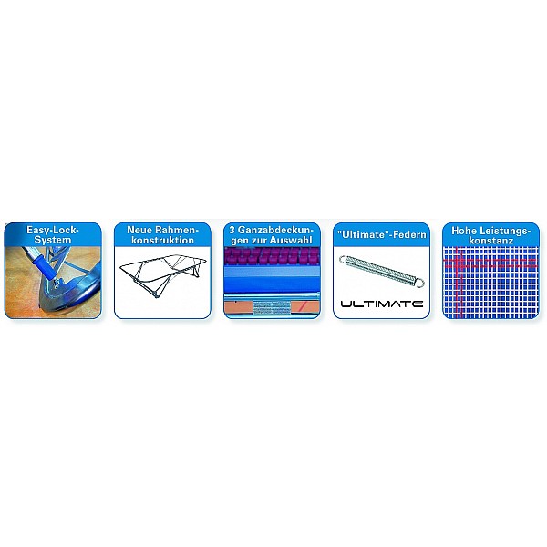 Set high performance trampoline class, setting new standards in durability, ease of use, stability and security. Official Trampoline World Championships in 2013 in Sofia and 2015 in Odense. Jumping sheet: 426 x 213 cm 4 x 4 mm nylon straps with sewn pins 118 held by heavy duty springs. Setting: special steel galvanized, 520 x 305 x 115 cm (L x W x H). 200% more stiffness of the foot construction for extremely high stability of the frame. Shock absorbing and stable frame pads Full cover with durable heavy-duty Velcro, 32mm thick. Patented easy-lock system "for the simple construction of the trampoline by an individual weight with roll stand: Abstellmaß kg 260 on roller stands.:. (L x B x H) 321 x 80 x 220 cm FIG certified storage dimensions on roller stand (.. L x B x H):. 321 x 80 x 220 cm storage dimensions on lifting roller stand (L x W x H): 334 x 80 x 197 cm ".