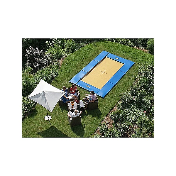 The EUROTRAMP Grand Master Outdoor ground trampoline is placed over a 1.15 m deep pit and is a very good alternative to stand-up trampolines. Due to the ground level, falling or crawling underneath is impossible. An extremely good and equally soft throwing behavior enables controlled jumping and makes it a special experience for both children and adults. Jumping net made of PVC-coated mesh fabric.