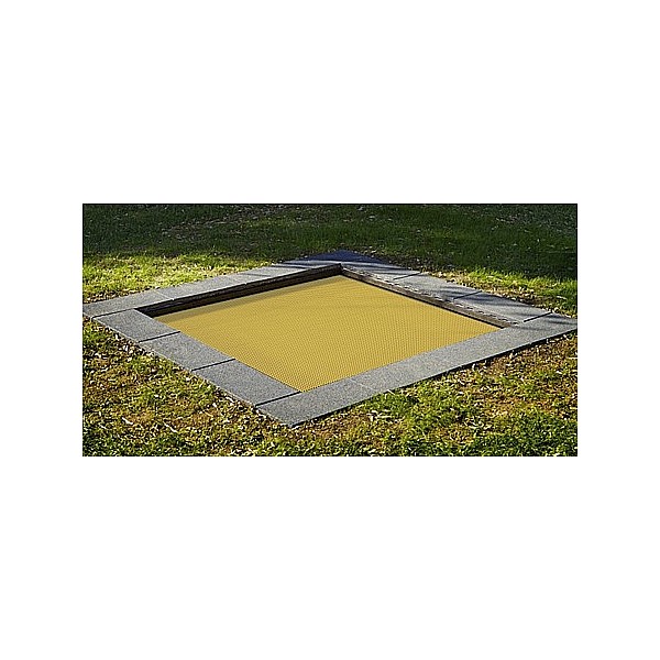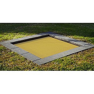 Frame profile 150 x 150 x 30 cm of high quality steel for installation in the ground, hot dip galvanized, pit depth 30cm + 10cm below the jump area. Jumping sheet made of PVC coated mesh (107 x 107 cm). 36 steel springs length 185 mm, Ø 20 mm, kg weight 113th For kindergartens and other facilities with controlled access.