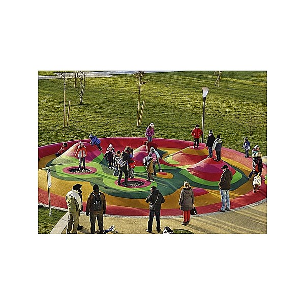 56 steel springs length 185 mm, Ø 20 mm. For kindergartens and other institutions supervised playground area. UV light and weather resistant. safety slab system according to EN 1176. Included safe, for mounting frame 200 x 200 cm, with suitable adhesive material. Weight 113 kg. For transportation on delivery two people are required.
