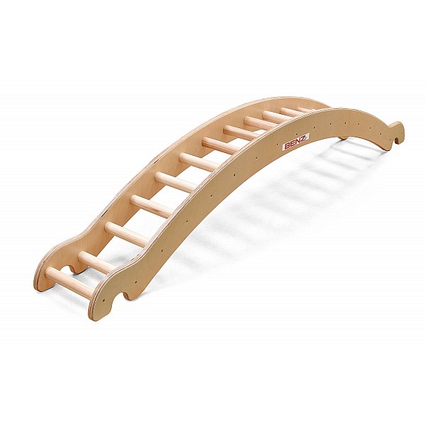 Length 210 cm, with two-sided form ends for hooking in BENZ vaulting boxes with special recesses. Hooking with bow up or down is possible. In connection with several gymnastic boxes and several curved ladder, a challenging, attractive course can be installed for climbing. By inserting a gymnastics mat, the curved ladder can also be used as a seesaw and therapy device on the floor.