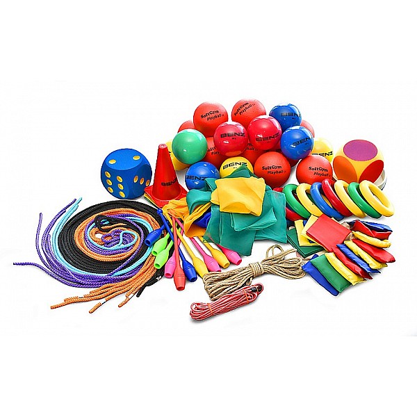 Sports and Spielmaterialset for "KITUKA". Curated products. The compilation takes into account the specific requirements for motor skills, coordination and movement in infants and children in preschool / or primary school age. The set consists of. 10 x foam-play ball, 10x exercise ball (Assorted), 10x tennis ring 180g, 10x bean bags (assorted), 10x gymnastics rope (assorted), 1x swing cable 8m, 1x gymnastics cord 8m, 30x Gymnastik- / & juggling cloths (Assorted) 10x children's gymnastics club (assorted colors), 2x foam cubes 16x16x16cm, 1x tambourine, 4x Markierungskegel (assorted colors)