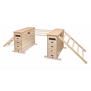 To expand your climbing parkour, you can anchor existing BENZ gymnastic benches in the special recesses of the vaulting boxes. The ladders supplied have hooks at the upper ends for easy attachment to the vaulting boxes. To prevent the rung bars from sliding too deeply into the vaulting boxes, they have been fitted with stoppers. You can find suitable accessories for combining, extending and attaching to the BENZ complete set Maxi in our BENZ online shop.