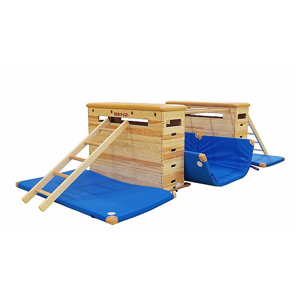 With our popular BENZ complete set Maxi made of solid pine wood, you can quickly and easily build a small movement landscape. The ladders and rungs give the vaulting boxes a variety of gymnastics possibilities in children's gymnastics or school sports. The complete set Maxi also offers completely new challenges for people with disabilities.