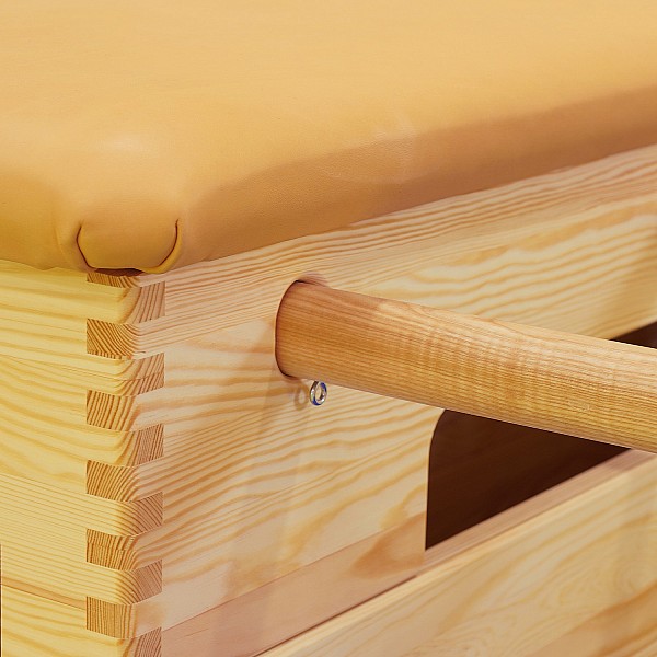 Create movement landscapes individually adapted to your protégés and build up the BENZ complete set Maxi in an infinite number of variations and gymnastics park courses. The set consists of two 5-piece vaulting boxes made of solid pine wood and a lid with core cowhide cover and two ladders with different widths and rung rails. The special holes and recesses on the sides of the top allow the vaulting boxes to accommodate ladders, rungs and gym benches. The height of the vaulting boxes can be varied by their individual parts and they are stackable thanks to the built-in pegs. The feet provide a stable stand and have rubber buffers. Thanks to the rolling devices, the whole ensemble can also be easily transported by children.