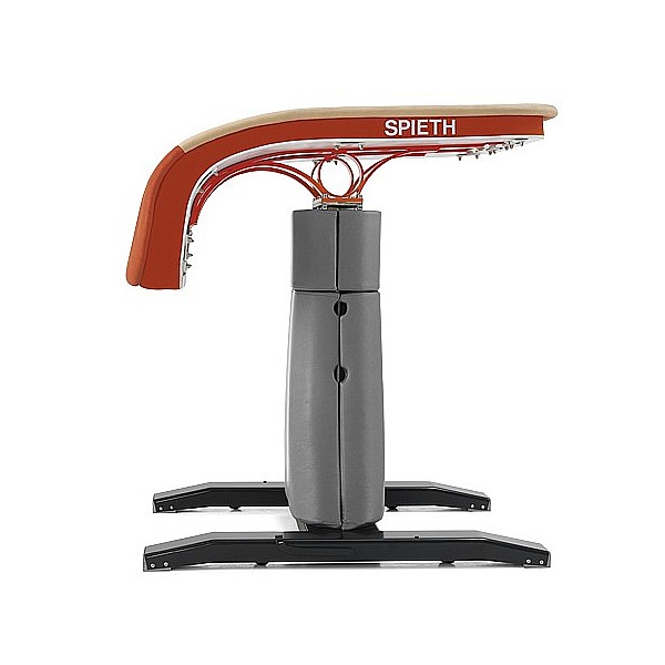 Vaulting table including tilt and pull drive. Central base with comfortable, stepless height adjustment from 100-135 cm. The height can be adjusted quickly and safely using a foot pedal. Body with double panels and appropriately arranged spring and damping elements.