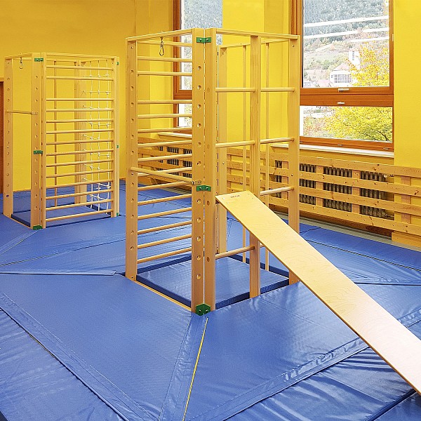 In the case of fixed Junior elements from BENZ as a tower, the specially adapted set of mats provides optimum safety when romping and playing on the gymnastic equipment. The mats are laid out inside the tower and around the tower.