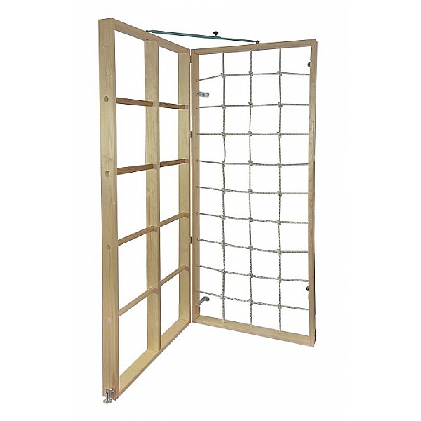 A pivot fitting for connecting and folding out of a rectangular Junior element. An element is mounted on the wall. The fixed to the swivel fitting and hinges thereon member folds out angle and beturnen so both sides at 90 degrees. For delivery, the hinges for connecting the elements, except the angle are swivel fitting which is mounted at the top with screws for mounting on the wall, Diagonal-determining means and a bottom stopper for fixing the folded-out element on the ground. Price without installation. Junior elements you can put together individually according to your own imagination - whether as wall mounted or tower. The tower has an optimal stability with its 4 Boom. To secure we recommend our special, precise Junior Tower mat set. Alternatively Leichtturn- or standard gym mats can be used.