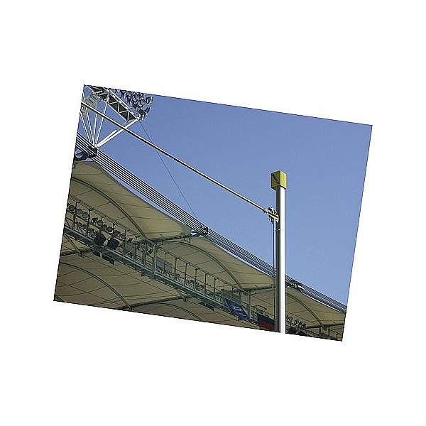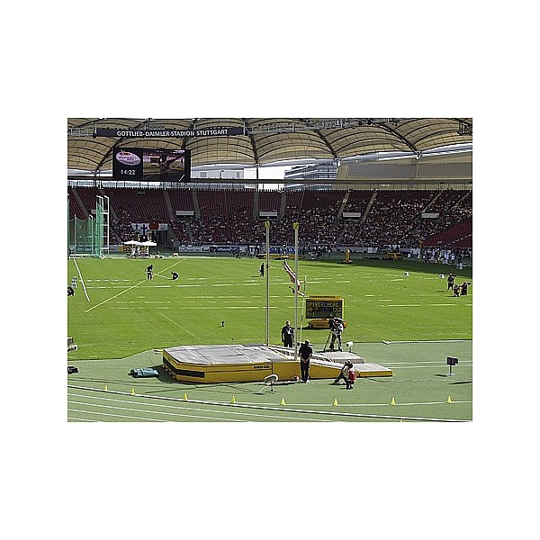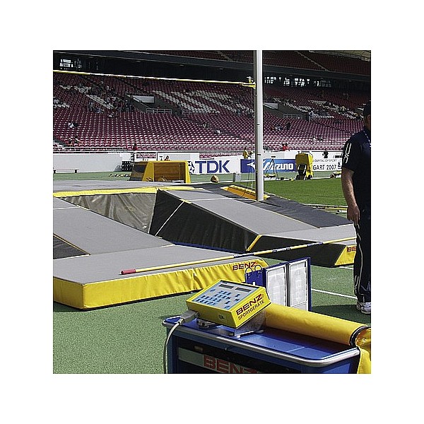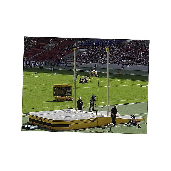 After provisions of the DLV and the IAAF. Complete aluminum construction, stand mm from profile 98 x 142, silver anodized. All moving parts are made of stainless steel or plastic. Edition 150-650 cm, height adjustment by crank in connection with textile-reinforced toothed belt system via an internal gear.