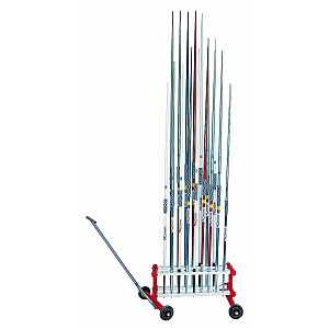 Javelin rack on wheels. Sturdy steel tubing construction with movable shaft, powder-coated, for max. 18 javelins. The steerable hand drawbar enables easy transport. Supplied disassembled in cardboard box. Dimensions (W x H x D) 51 x 94 x 40 cm, weight 13 kg.