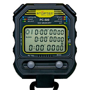 The Schütt PC-500 stopwatch is a 500-file memory stopwatch with a large three-line display. It shows lap times, split times, and the current running time. The recorded times remain stored in the watch until manually deleted.