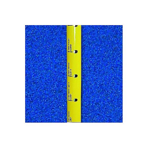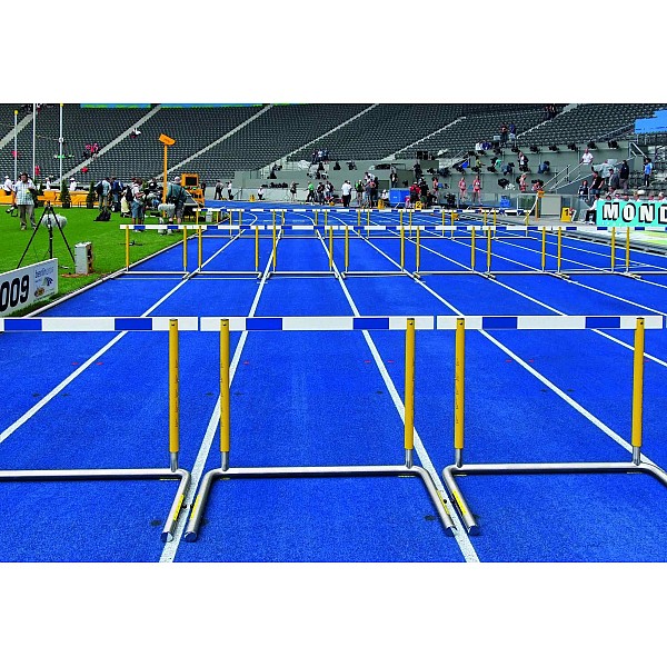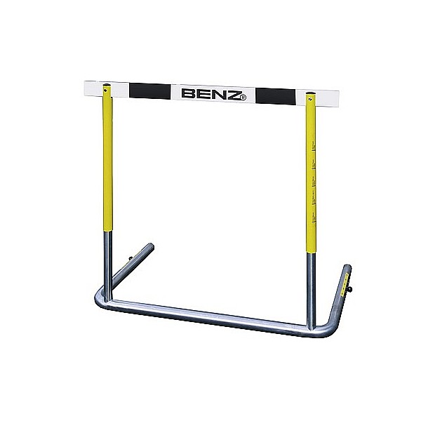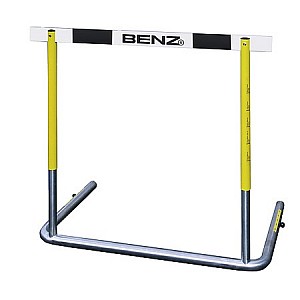 The BENZ competition hurdle is based on a fully welded steel-aluminum construction. The counterweight with grid locking is galvanized. The telescopic inserts have a mechanism for quick, simultaneous height adjustment (DBGM). Scales are provided for height and weight adjustment. The hurdle complies with IAAF guidelines.