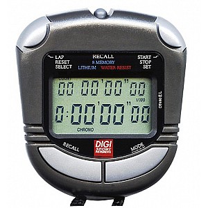 Entry-level model with extra large two-line display. 50 memory locations for lap, split or finish times. Stop function 9 hrs., 59 min. and 59.99 sec. time with date and alarm. Countdown timer and pacer function. Water and impact resistance.