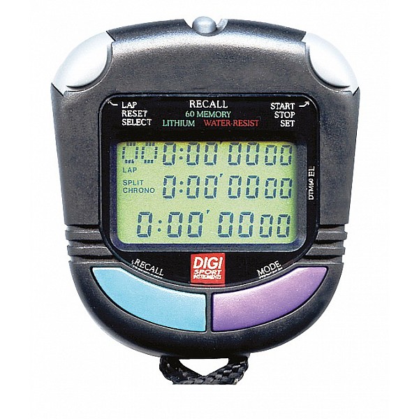 Three-line display, all times at a glance. 60 memory locations for lap, split or finish times. Range 9 hrs., 59 min. and 59.99 sec. time with date and alarm. Display of fastest, slowest and average lap time. Timers, time-out function Pacer with 30 sec. (10 to 320 / min.) Water and shock resistant.