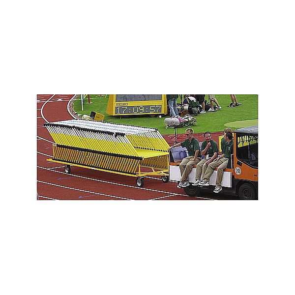 Sturdy steel construction with large solid rubber wheels for easy loading of hurdles, accessible from the rear, bearing length 3.95 m. Load capacity 40 World Cup hurdles. With drawbar for towing hitch. With caster wheels in front, thus extremely stable, even in extreme curves.