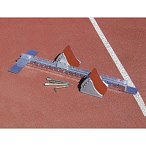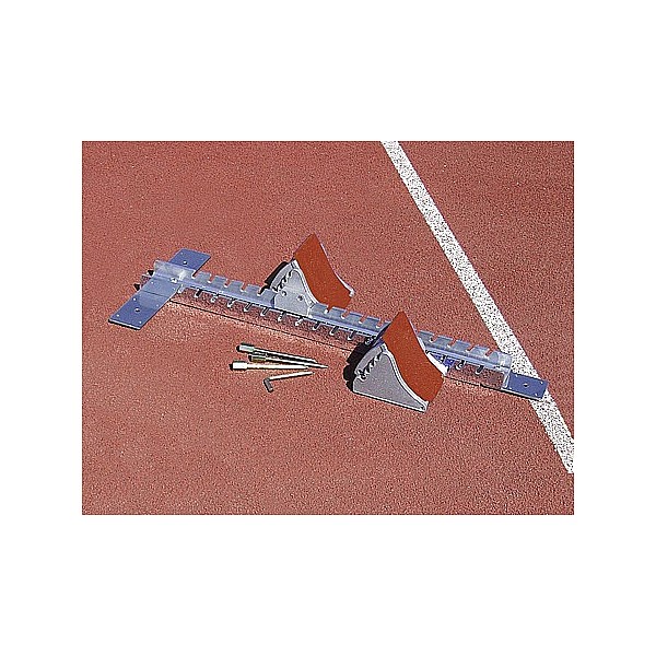 Starting block Olympic. Aluminum rail, with thorns for mounting on tartan surfaces. Through the three supplied ground anchor this starting block can also be easily and securely attach to dirt tracks. Aluklötze with tartan covering and multi-adjustable angle of attack.