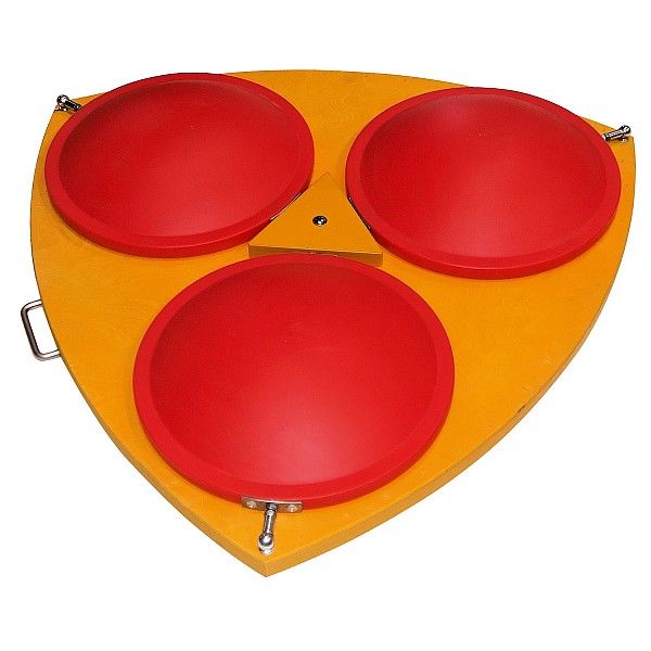 A fun balance game for kids and adults that draws attention in school sports and at sporting events. 3 therapy spinning tops are connected to each other via a triangular playing surface. By shifting the body weight of the players standing on the therapy spinning tops, the position of the playing surface is changed and the balls start rolling. The goal of the game is that the ball stops in one of the 4 holes in the base plate. The target hole is determined together beforehand. The device can be folded after use to save space and easily transported by attached handle. Delivery without balls!