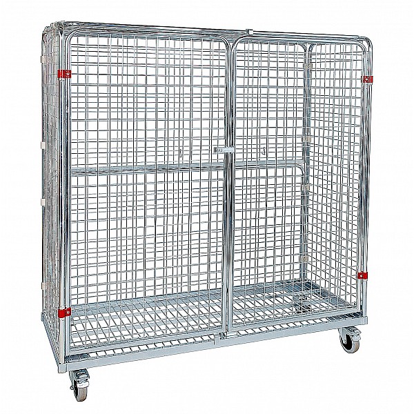 Open equipment trolley without doors and roof, galvanised blue. Frame made of rectangular tube 40 x 20 mm, 2 side walls and 1 rear wall made of round tube Ø 22 mm, with wire infill 50 x 50 x 4 mm. 4 ball bearing swivel castors Ø 125 mm, 2 with brakes and treads of grey rubber. Load capacity 800 kg. Weight 68,6 kg. Delivery ex manufacturer, carriage forward. Specifications: Material Steel, galvanised blue Dimensions (w x h x g) 135 x 182 x 95 cm Inner dimension (w x h x g) : 129,8 x 160,5 x 92 cm. 4 ball bearing swivel castors Ø 125 mm 2 Brakes Load capacity 800 kg Weight 68,6 kg