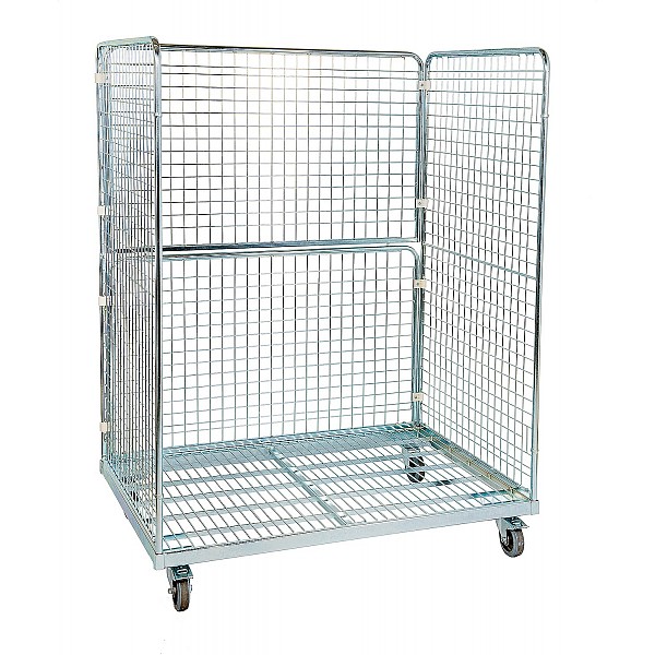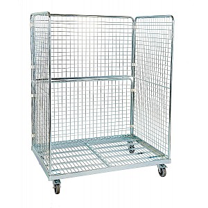 Open equipment trolley without doors and roof, galvanised blue. Frame made of rectangular tube 40 x 20 mm, 2 side walls and 1 rear wall made of round tube Ø 22 mm, with wire infill 50 x 50 x 4 mm. 4 ball bearing swivel castors Ø 125 mm, 2 with brakes and treads of grey rubber. Load capacity 800 kg. Weight 68,6 kg. Delivery ex manufacturer, carriage forward.