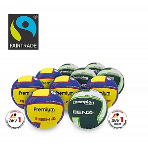 TheBENZ Fairtrade Volleyball Package School consists of 8 practice balls with reduced weight, which are ideal for children and beginners, and 2 competition balls made of PU leather with soft touch surface and DVV1 certificate. Both balls have the Fairtrade label and thus ensure fair working conditions and sustainable production in the manufacturing process. The combination of eight 25% lighter practice balls and two high-quality DVV1 competition balls is ideal for use in schools and clubs.