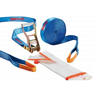 Slack Line Basic 2-piece with a protective case, width: 50 mm, length: 15 m. Blue ribbon with 8-10% elongation and a stitched and reinforced loop for looping. Ratchet 50 mm wide, with locking pawl for locking and a large loop, 2 m long. The protective cover 50 cm long, to cover the ratchet provides an added level of security. All packed in a handy backpack bag.