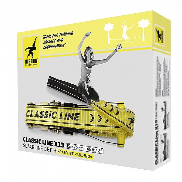 The yellow Gibbon Slackline Classic X13 (15 meters) is a classic for all beginners and all-rounder to the popular Slacklines. The included ratcheting protection (Ratpad), this set also meets the DIN guidelines for slacklining.