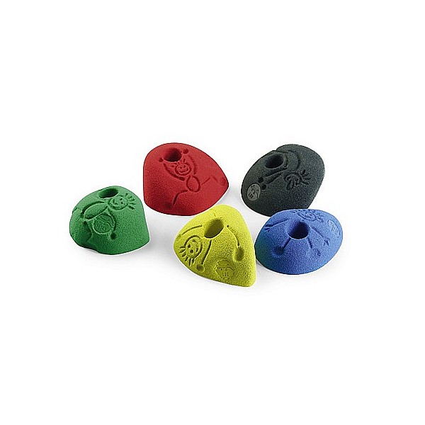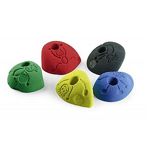5 climbing handles with funny motifs that stimulate children's imagination. This special grip set has been produced with funny illustrations, in stick figure design. The climbing grip set is tailor-made for the special ergonomic requirements of children's hands.