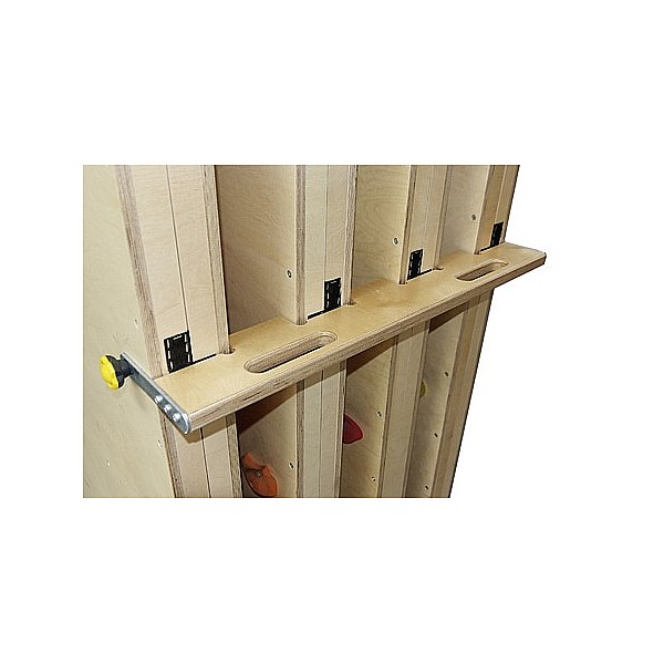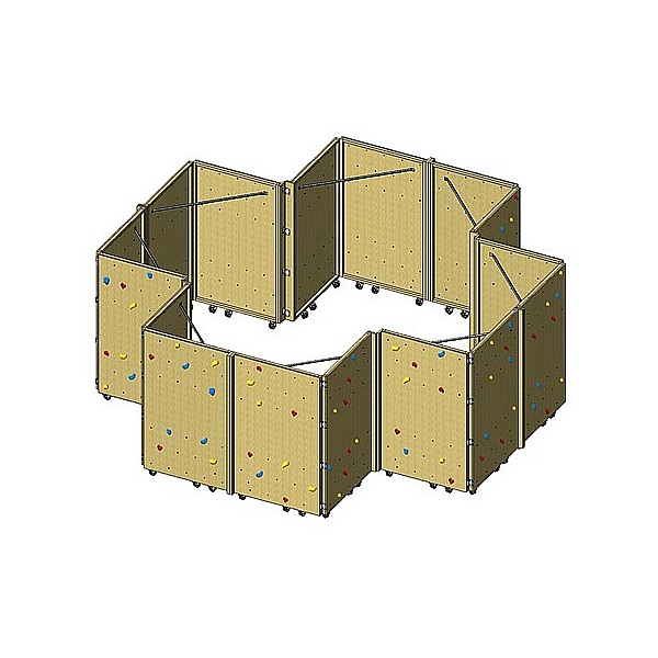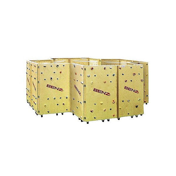 The mobile Boulder wall for training and Schulbereich.16 wall elements 200 cm high, 120 cm wide, with cm in a grid of 25 x 25 drilled threaded sleeves for climbing holds. The bores are arranged so as to climb over is restricted. Each climbing element is equipped with brake rollers. The facility has a footprint of 550 x 550cm.