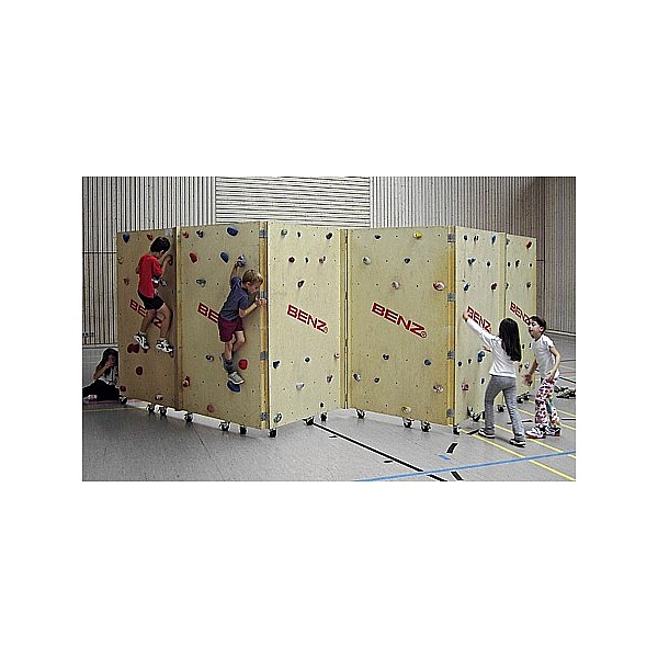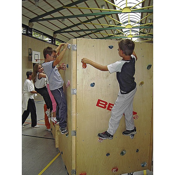 The mobile Boulder wall for training and Schulbereich.16 wall elements 200 cm high, 120 cm wide, with cm in a grid of 25 x 25 drilled threaded sleeves for climbing holds. The bores are arranged so as to climb over is restricted. Each climbing element is equipped with brake rollers. The facility has a footprint of 550 x 550cm. Recommended safety area around 250 cm. At the same time 16 children bouldering. The simple design is Roll and Boulderin ready complete 5 minutes. Total height of 210 cm incl. Roles. There is no restriction on the Geräteraumtorhöhen. Space required in the equipment room, incl. The assembled climbing grips 102 x 267 cm. Total weight 600 kg. The arrangement of the many large-sized brake rollers, the maximum remains. Soil pressure under 1 N / mm2 (without climbing holds).