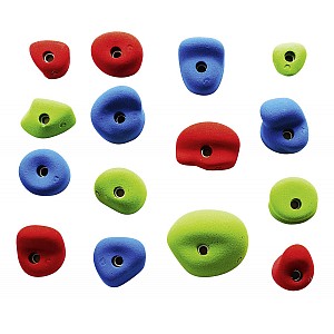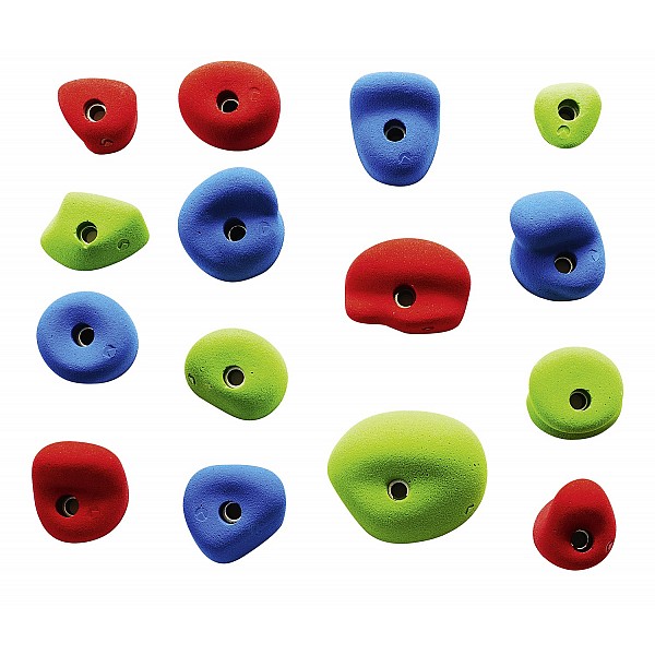 15 large-size school climbing handholds in different colours. For schools, educational and therapeutic aplication. These set of school climbing handles is compiled and developed for use on vertical, overhanging and inclined climbing and bouldering walls, to meet the demands. They are ideal for the routesetting. The climbing holds are different in their size.