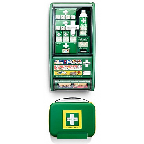 The first aid station with various first aid products intended for use in first aid situations, particularly suitable for workplaces where there is a risk of burns. The products in the Cederroth First Aid & Burn Station first aid station are easily accessible and protected from dust and moisture by transparent lids. Particularly suitable for occupational groups with an increased risk of burns, e.g. cooks, electricians, welders, for school or company canteens.