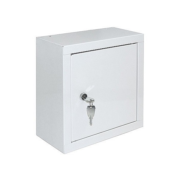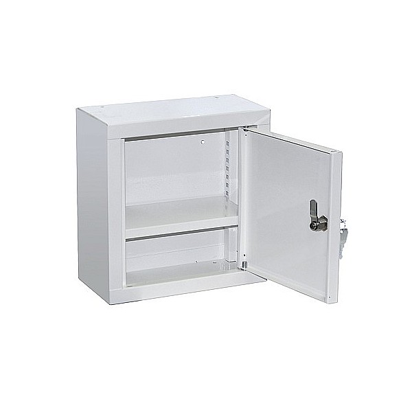 Sheet steel painted white, single door, lockable, one adjustable shelf. Without filling. Dimensions (W x H x T): 30 x 29 x 14 cm.