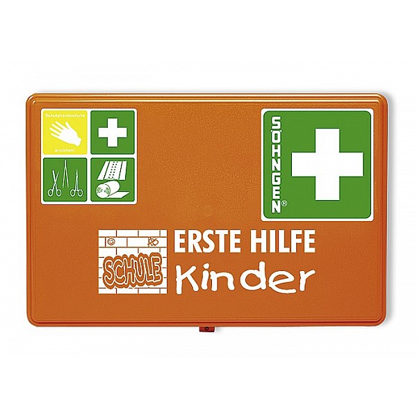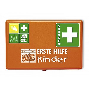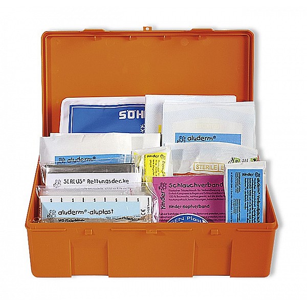 Plastic box, orange, 26 x 16 x 7 cm. First-aid filling DIN but adapted according to DIN 13157/2021. High field dressings, bandages, plasters, etc. are in size and design to the needs of children.