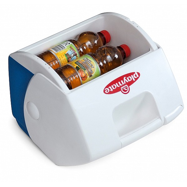 Small blue cooler with pivoting cover. Accommodates 9 drinking cans. Content 6 l (about 6 bottles of 0,5 l), cooled up to 24 hours. Delivery without cooling pillow. (L x B x H) 298 x 210 x 305 mm, 1.0 kg.