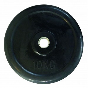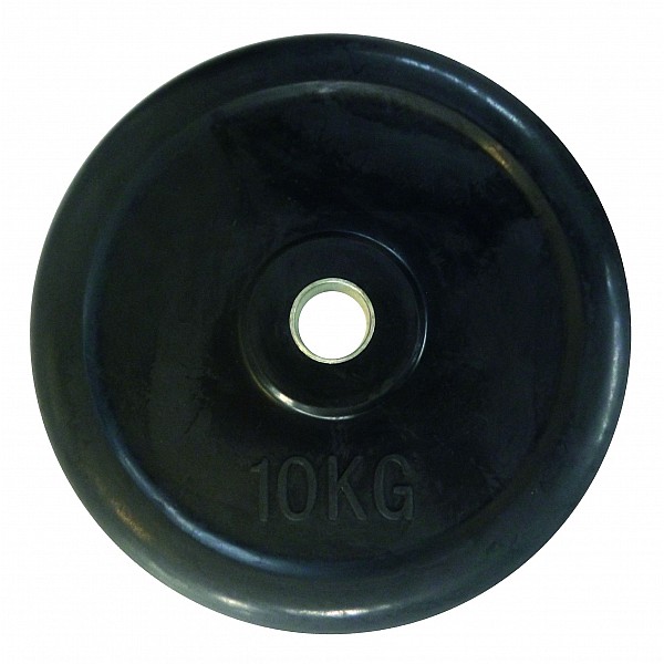 Weight plate, black, rubber coated, 10 kg, diameter about 26 cm, thickness 4 cm, 3 cm receiving