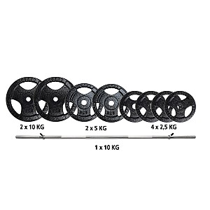 Barbell set, 24.5 kg, 30 mm holder, set for beginners consisting of: - 1x barbell bar, 30 mm holder ( 7 kg weight) - 2x weight plate 1.25 kg - 2x 2.5 kg weight plate - 2x 5 kg weight plate - 1 pair of "Power Extreme" quick fasteners, 30 mm