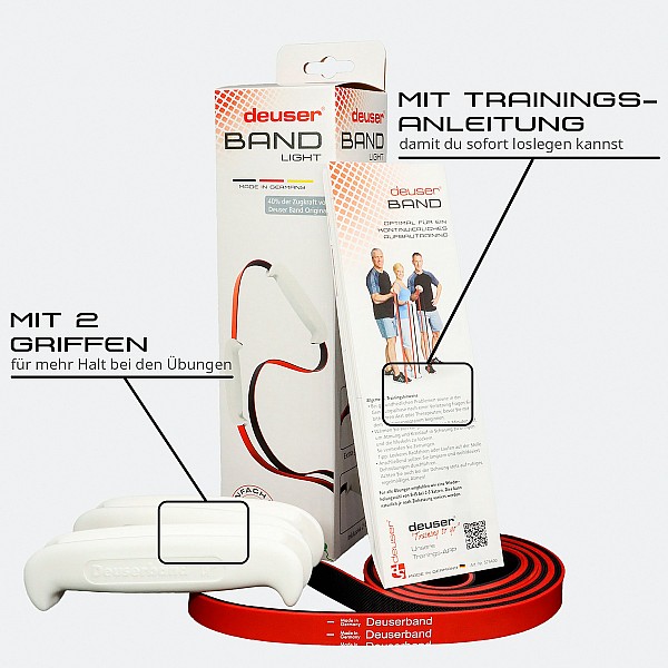 However Deuserband light design as the original Deuserband with 40% reduced traction Optimum training device to build muscle after injury, illness, etc. Incl. Plastic handles.
