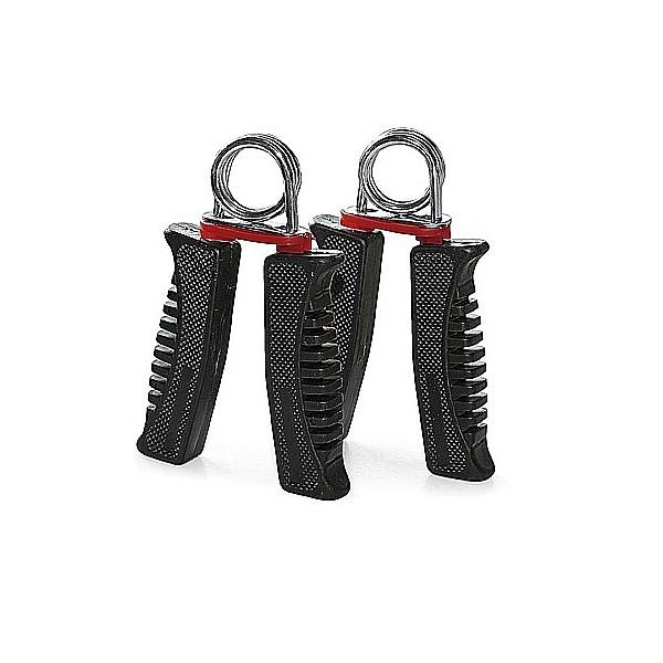 Chrome-plated steel spring with plastic handles, for finger and forearm workout.