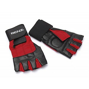 Training gloves, red/ black, made of genuine goatskin. Open finger grip. Cushioned foam gloves and velcro closure. Additional 25 mm long wrist wrap.